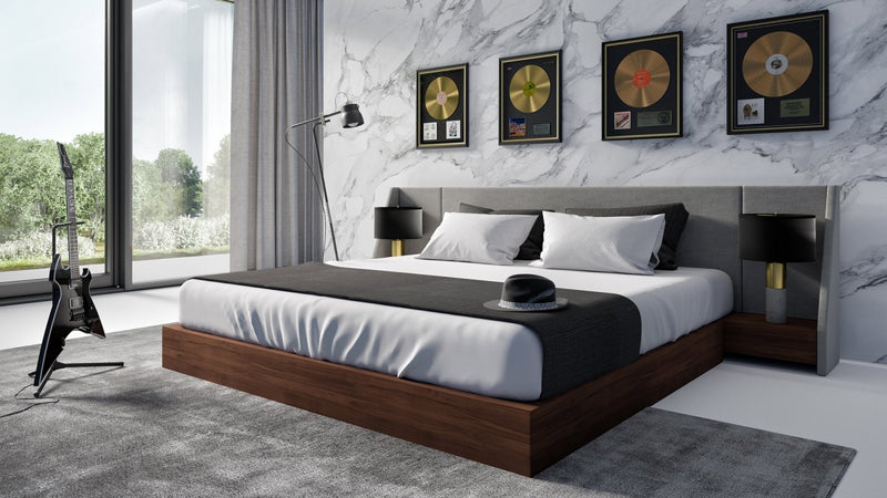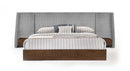 Nova Domus Janice - Modern Grey Fabric and Walnut Bed and Nightstands
